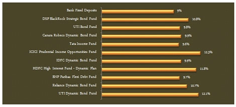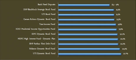 Over a three year tenure top performing long term income funds have given 1.5 - 2% higher returns compared to fixed deposits. On 1 lac investment the returns from income funds over a three year investment horizon would be 2,000 to 6,000 higher compared to fixed deposits on a pre-tax basis. On a post tax basis the difference in returns will be even higher, as we will discuss later in the article. The chart below shows the trailing three year annualized returns of the top income funds.