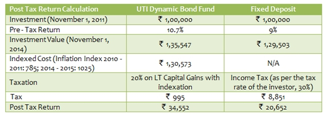 Let us see the difference between post tax returns of a long term income fund and fixed deposit with the help of an example. Let us assume you invested 1 lac in UTI Dynamic Bond Fund on November 1, 2011. Let us see how your post tax returns compare with a 1 lac investment in fixed deposit at 9% interest over the same tenure.